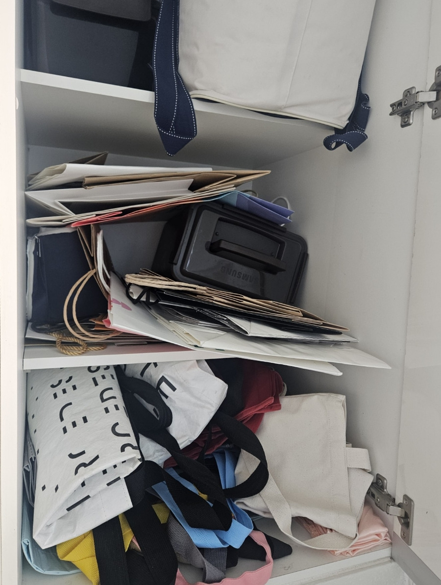 5분도 채 걸리지 않았는데, 쌓여 있던 쇼핑백과 에코백이 말끔하게 정리됐습니다.