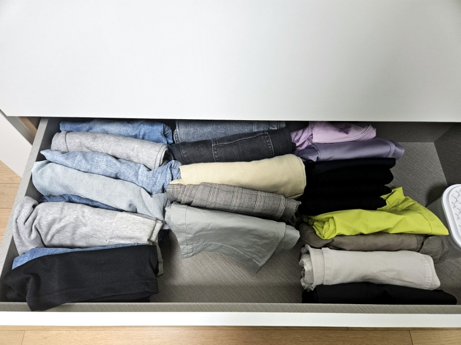 꽉 차 있던 바지 서랍 칸이, 긴 바지 몇 개를 더 넣었는데도 자리에 여유가 있을 정도로 많이 정리되었습니다.